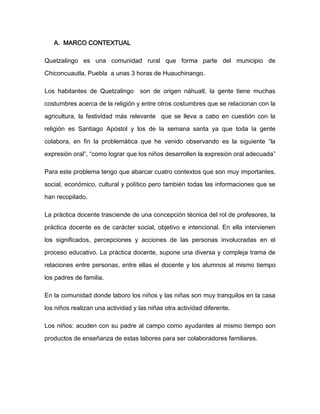 Este documento presenta un estudio sobre el desarrollo de la expresión oral en niños de una comunidad indígena en Puebla a través del uso de la dramatización. Describe el contexto social y educativo de la comunidad, incluyendo las dificultades que enfrentan los niños para comunicarse oralmente. Establece como objetivo principal lograr que los alumnos mejoren su expresión oral mediante actividades de dramatización dentro y fuera del aula. Finalmente, justifica la necesidad de abordar este problema que ha existido históricamente en la comunidad