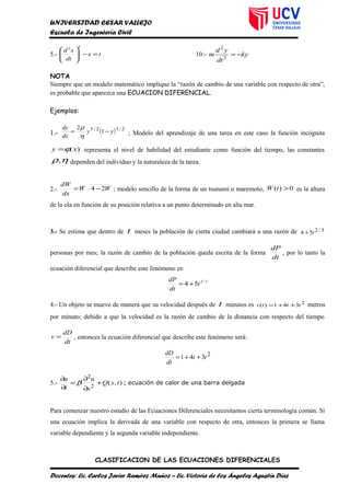 Este documento introduce las ecuaciones diferenciales y su importancia para modelar fenómenos físicos. Explica que una ecuación diferencial contiene derivadas de una función desconocida con respecto a una o más variables independientes. Luego clasifica las ecuaciones diferenciales en ordinarias y parciales, y define el orden y grado de una ecuación diferencial ordinaria. Finalmente, introduce la noción de ecuación diferencial lineal.