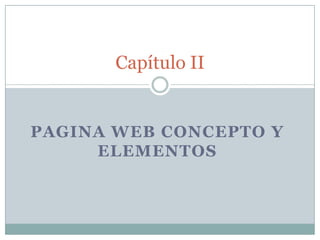 Este documento describe conceptos clave relacionados con el diseño de páginas web, incluyendo páginas web, sitios web, HTML, hipervínculos, lenguajes de programación, editores, servidores, clientes FTP, hosting, dominios, ISP, URL, applets, frames, webmasters, tablas, banners, imágenes y propiedades. También describe elementos comunes de páginas web como texto, imágenes, audio, Adobe Flash, scripts, meta tags, hojas de estilo y plantillas. Finalmente, menciona algunos portales y