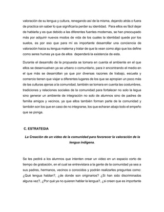 El documento presenta una propuesta metodológica basada en el enfoque sociocultural de Vygotsky. Propone involucrar a los estudiantes indígenas en actividades que fortalezcan su identidad étnica y lengua materna. Describe una estrategia para crear un video de la comunidad con entrevistas que muestre la cultura y promueva el valor de la lengua indígena. El objetivo es que los estudiantes se apropien más de su comunidad y cultura para frenar la pérdida de la lengua.