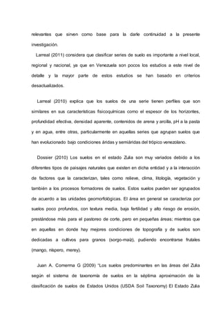 Este documento presenta una revisión de literatura sobre investigaciones previas relacionadas con la caracterización de suelos. Se describen estudios realizados por varios investigadores sobre las propiedades físicas y químicas de suelos. También se mencionan los principales tipos de suelos presentes en el estado Zulia como aridisuelos, ultisuelos, alfisuelos y entisuelos. Finalmente, se resaltan factores como el relieve, clima y vegetación que influyen en la formación de los suelos en la región.