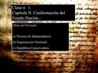 El documento detalla el proceso de formación del estado-nación en América Latina, destacando hitos clave como la independencia y la organización nacional. Se discuten movimientos influenciados por la Ilustración y la Revolución Francesa, así como el impacto de la invasión de Napoleón en España y su efecto en América Hispana. Finalmente, se menciona la creación de la primera junta nacional de gobierno en Chile en 1810 y sus principales logros.