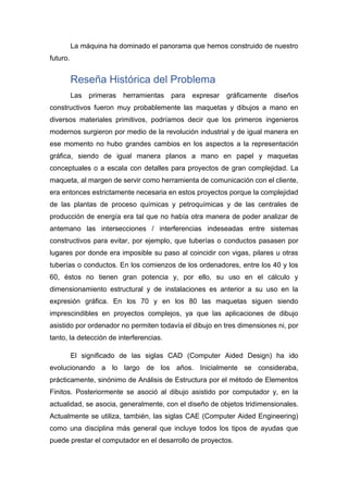 El documento analiza la evolución del diseño asistido por computadora (CAD) y su impacto en la arquitectura e ingeniería, destacando cómo ha mejorado la productividad y la calidad del diseño. Se menciona la necesaria adaptación de las universidades y profesionales a estas tecnologías para optimizar los procesos de diseño, así como la importancia creciente del modelado de información de construcción (BIM) para la gestión eficiente de proyectos. Además, se identifican las barreras para la adopción de nuevas tecnologías debido a resistencias culturales y presupuestarias.