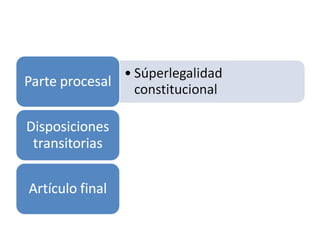 El documento define la constitución como el conjunto de normas y preceptos fundamentales que determinan la organización del poder público, las bases de la vida social y económica, y los derechos y deberes de los individuos de un estado. Explica que la constitución es el estatuto supremo y absolutamente obligatorio expedido por el órgano representativo de la soberanía nacional, que consagra los derechos humanos y determina la organización fundamental del estado. Finalmente, clasifica las constituciones atendiendo a su aspecto formal, los trámites para reformarlas