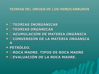 Las teorías del origen de los hidrocarburos están estrechamente ligadas a las rocas madre, que son rocas sedimentarias ricas en materia orgánica. La presencia de una facies-madre generadora de hidrocarburos es indispensable para la formación de yacimientos petrolíferos. Las rocas madre más comunes son sedimentos marinos ricos en plancton, sedimentos deltaicos ricos en plancton y restos vegetales, y localmente sedimentos continentales ricos en lignito. La evaluación de las rocas madre incluye análisis de su conten