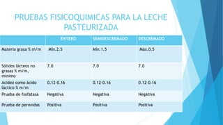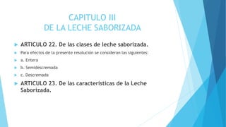 Este documento establece las características y especificaciones de la leche saborizada y la crema de leche. Define tres tipos de leche saborizada (entera, semidescremada y descremada) y tres tipos de crema de leche (semi-entera, entera y rica en grasa). Además, detalla los requisitos fisicoquímicos y microbiológicos para cada producto, así como los ingredientes y aditivos permitidos.