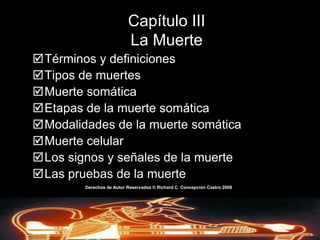 Este documento describe los conceptos clave relacionados con la muerte, incluyendo términos, tipos, signos y pruebas. Explica la muerte somática y celular, así como las etapas y modalidades de la muerte somática. También describe los cambios que ocurren en el cuerpo después de la muerte, como la rigidez cadavérica, la lividez post mortem y la descomposición, que son señales importantes para los embalsamadores. El documento provee una referencia valiosa sobre la comprensión de la muerte y sus implic