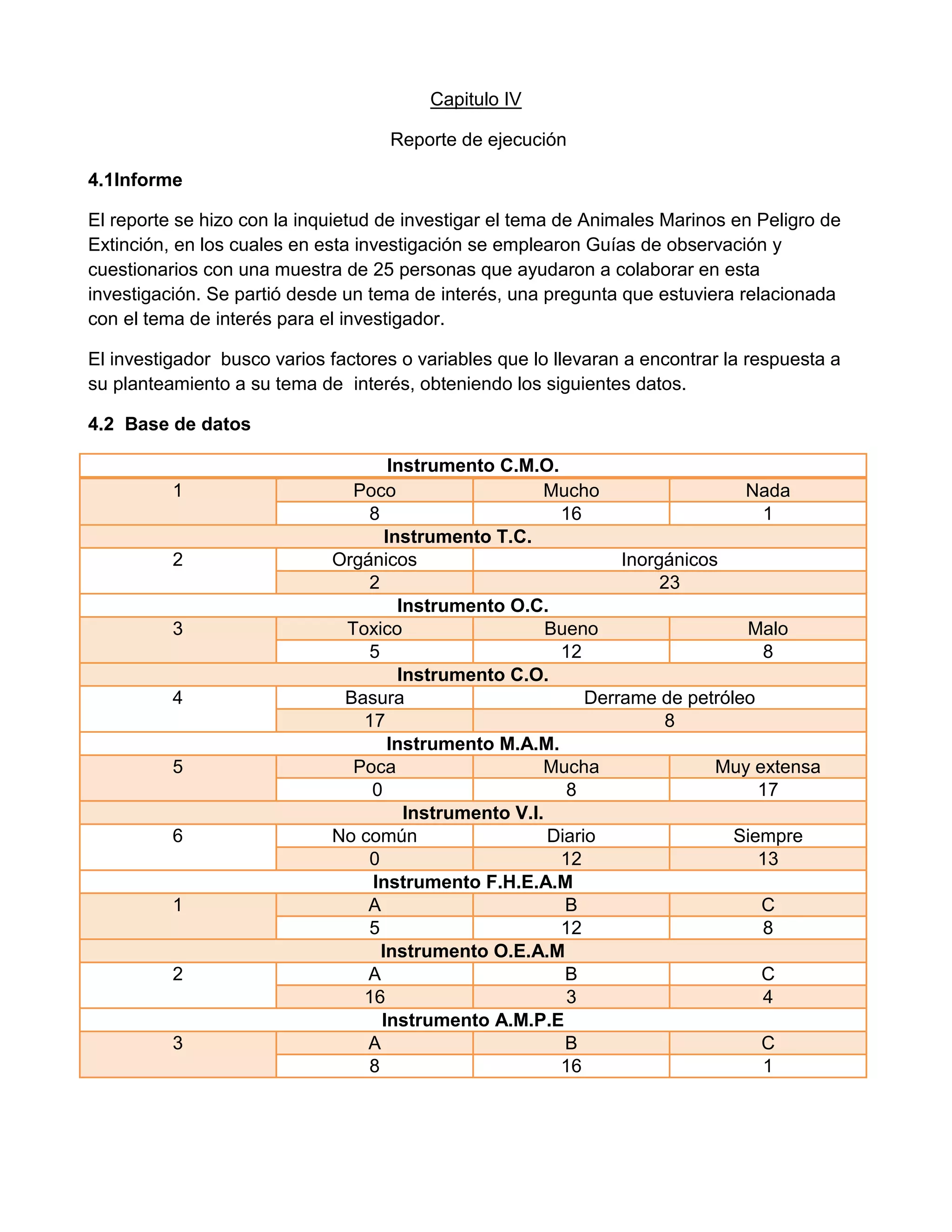 Este documento presenta los resultados de una investigación sobre los animales marinos en peligro de extinción. Se aplicaron encuestas y observaciones a 25 personas para recopilar datos sobre varios factores como la contaminación de los océanos, tipos de contaminantes, malos olores, derrames de petróleo y muerte de animales marinos. El análisis de los resultados validó la hipótesis de que la contaminación de los océanos es el factor más importante que causa la extinción de animales marinos.