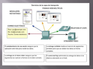 La capa de transporte del modelo OSI maneja la comunicación entre aplicaciones en hosts diferentes. Proporciona segmentación, reensamblaje, identificación de aplicaciones y confiabilidad de datos mediante protocolos como TCP y UDP. TCP proporciona comunicación confiable mediante conexiones orientadas, mientras que UDP es más simple y rápido aunque menos confiable.
