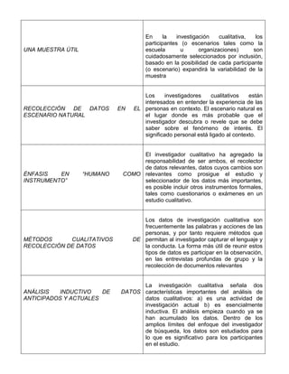 Este documento describe los principales enfoques metodológicos de la investigación cualitativa. Explica que la investigación cualitativa busca comprender fenómenos sociales y experiencias humanas mediante métodos como la observación participante y las entrevistas en profundidad. También destaca que la investigación cualitativa se caracteriza por tener un diseño emergente, seleccionar muestras para maximizar la variación, y analizar los datos de forma inductiva para generar nuevas teorías a partir de los hallazgos. El objetivo final es proporcionar una desc