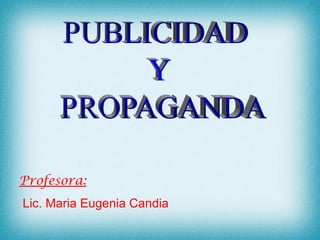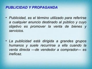 El documento describe los conceptos de publicidad y propaganda, así como sus diferencias. Explica que la publicidad busca promover la venta de bienes y servicios a grandes grupos, mientras que la propaganda intenta convencer a una audiencia para adoptar una actitud o acción específica. También analiza los diferentes tipos de propaganda, estrategias publicitarias y medios utilizados para llegar a los consumidores.