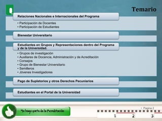 El documento describe la estructura de gobierno de una universidad, incluyendo los consejos curricular, de facultad, académico y superior. Explica que cada consejo tiene una composición y función diferente, desde supervisar programas académicos hasta establecer políticas para toda la universidad. También menciona actividades internacionales del programa como intercambios estudiantiles.