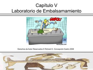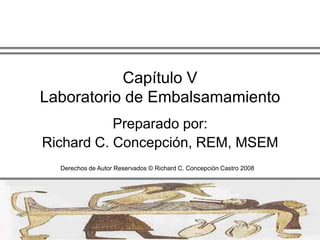 Este documento describe los aspectos fundamentales que debe tener un laboratorio de embalsamamiento. Explica que debe estar bien localizado, ventilado e iluminado, y tener el tamaño y equipamiento adecuados según el volumen de trabajo. También destaca la importancia de la limpieza, los colores y la estación de primeros auxilios.