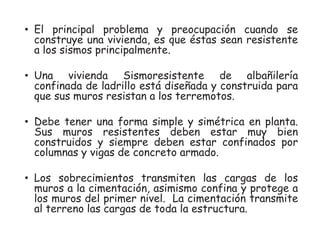 El documento describe los elementos fundamentales para construir una vivienda sismorresistente de albañilería, incluyendo cimientos profundos, muros confinados por vigas y columnas de concreto armado, y losas aligeradas unidas a los muros. Explica que la forma simétrica y la distribución uniforme de muros en ambas direcciones son esenciales para resistir sismos, al igual que usar materiales de buena calidad y técnicas de construcción apropiadas.