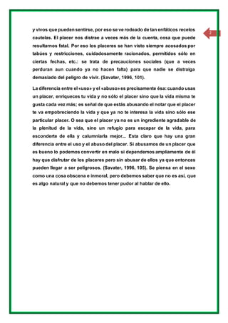 El autor critica la idea de que el sexo es inherentemente inmoral. Afirma que el sexo solo es inmoral si se utiliza para dañar a otros, al igual que comer el bocadillo de alguien o planear ataques terroristas podrían ser inmorales. El verdadero temor detrás de la obsesión con la inmoralidad sexual es el miedo al placer, ya que el placer sexual puede distraernos del peligro de vivir. Sin embargo, el placer solo se convierte en algo malo cuando dependemos demasiado de él