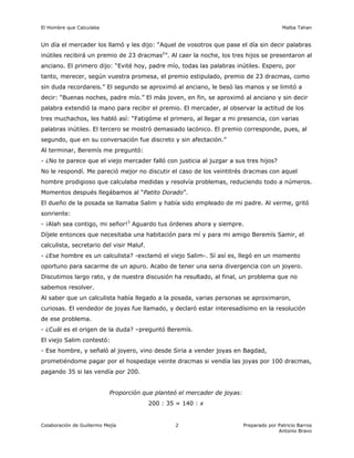 Beremís, un calculista hábil, resuelve un problema de deuda entre un posadero y un joyero aplicando proporciones matemáticas. Los presentes quedan impresionados por la sagacidad de Beremís para resolver el problema. Más tarde, Beremís explica que la incertidumbre en los cálculos es lo que hace interesante y prestigiosa a la matemática.