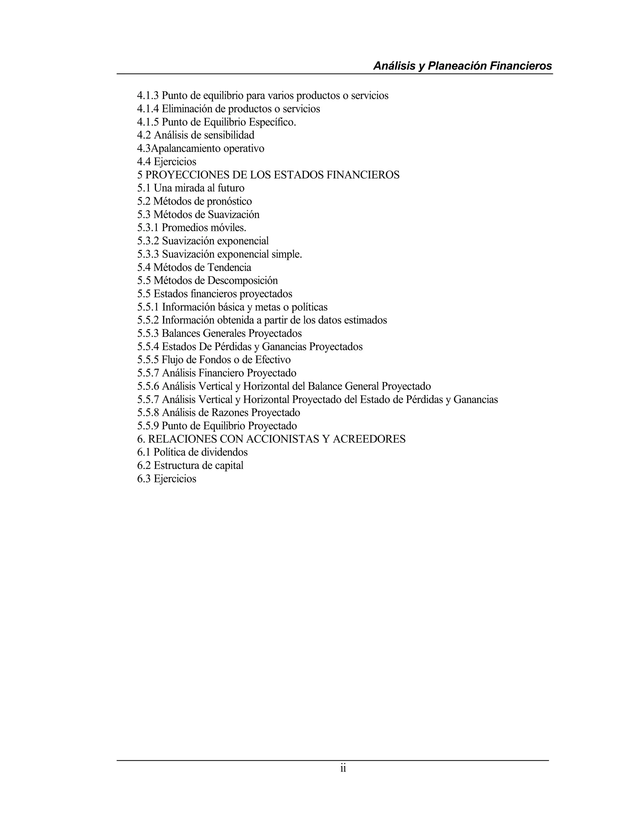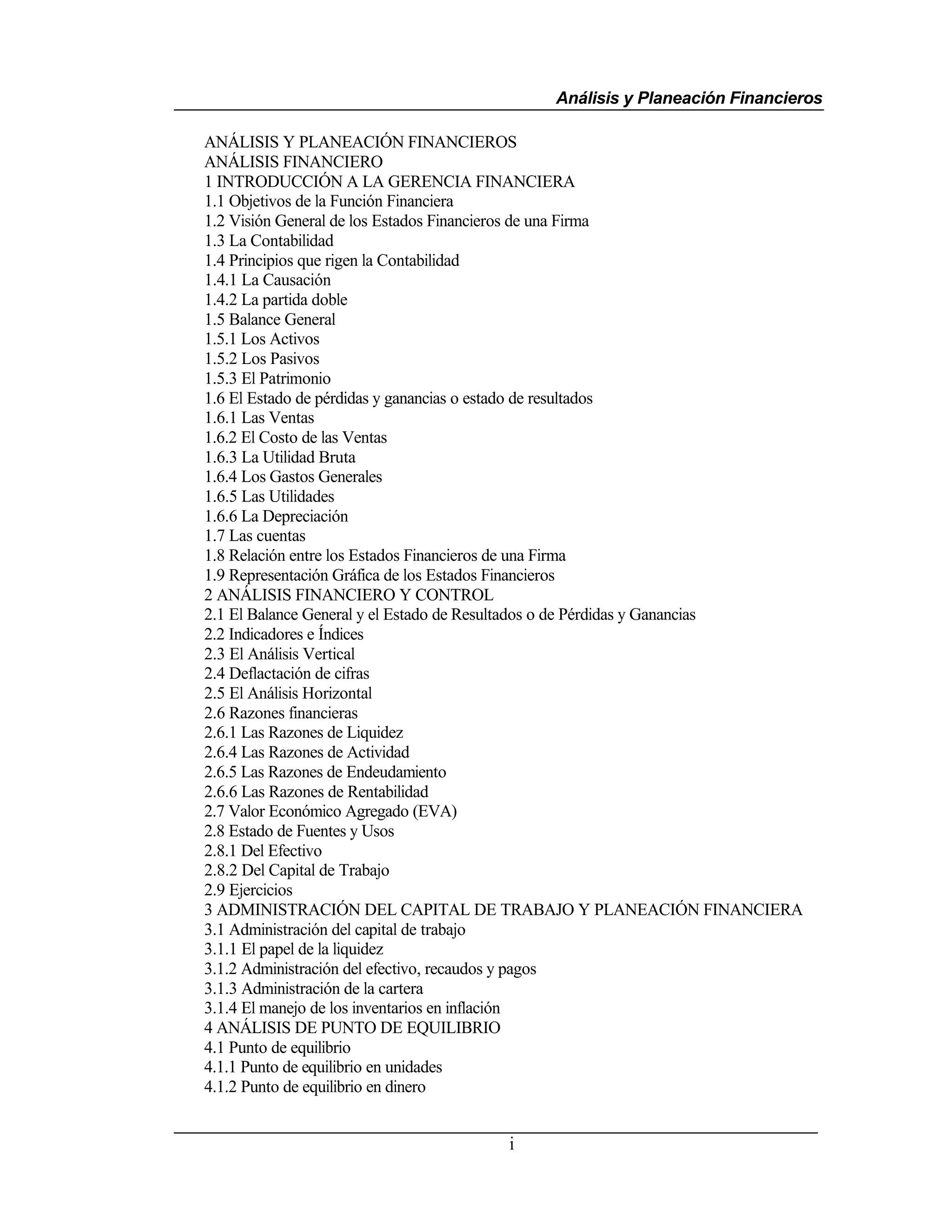 Este documento trata sobre el análisis y planeación financieros. Consta de seis capítulos que cubren temas como la introducción a la gerencia financiera, el análisis financiero tradicional, la administración del capital de trabajo, el análisis de punto de equilibrio, la proyección de estados financieros y las relaciones con accionistas y acreedores. El objetivo es capacitar al lector para realizar un análisis básico de la situación financiera de una empresa y contar con herramientas para la planeación y el control de