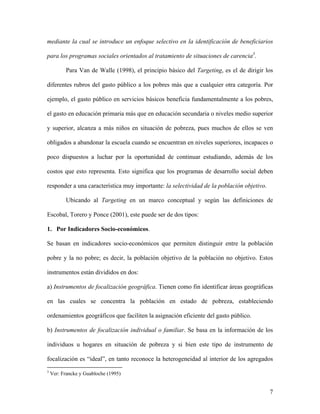 Este documento proporciona una introducción a los mapas de pobreza. Explica que los mapas de pobreza son herramientas que muestran la distribución geográfica de la pobreza dentro de un país y son útiles para las organizaciones que trabajan en reducir la pobreza. Luego discute que la focalización geográfica es más efectiva cuando se realiza a niveles más pequeños como distritos o vecindarios en lugar de niveles más grandes como estados o países. Finalmente, señala que la pobreza tiene ubicaciones geogr