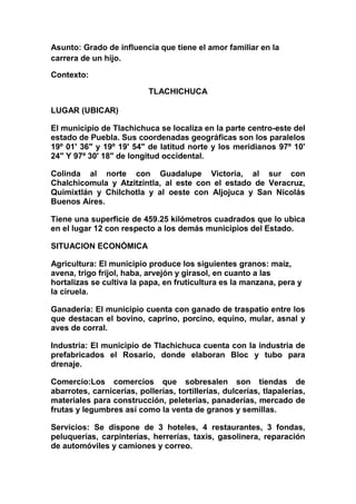 El documento describe la situación económica, geográfica y demográfica del municipio de Tlachichuca en Puebla, México. Señala que la agricultura y ganadería son las principales actividades económicas y que la población ha ido creciendo. También menciona que recientes encuestas sugieren que el apoyo y amor familiar influyen en el rendimiento académico y éxito futuro de los jóvenes de la región.