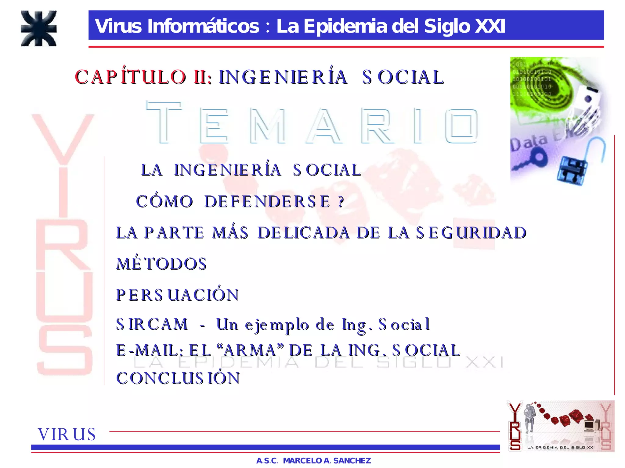 El documento habla sobre la ingeniería social y cómo se usa para propagar virus informáticos. Explica que la ingeniería social involucra el engaño y la persuasión para obtener información de las personas sin que se den cuenta, como hicieron los ejércitos italianos durante la Segunda Guerra Mundial. También describe cómo los creadores de virus usan técnicas como emails amistosos o curiosos para hacer que las personas realicen acciones que propaguen los virus, como fue el caso del virus Sircam.