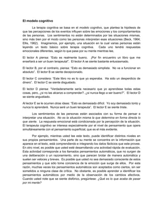 Este documento describe la conceptualización cognitiva en la terapia cognitiva. El terapeuta establece una hipótesis sobre cómo el paciente desarrolló su trastorno psicológico considerando factores como aprendizajes tempranos, creencias subyacentes y cómo ha sobrellevado creencias disfuncionales. La terapia cognitiva se basa en el modelo cognitivo donde las percepciones influyen en las emociones y comportamientos más que las situaciones mismas. Las creencias centrales y actitudes influyen en los pensamientos automátic
