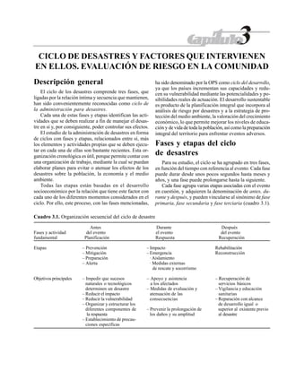 Este documento describe las diferentes fases del ciclo de desastres, incluyendo la fase antes del desastre (planificación), durante el desastre (respuesta) y después del desastre (recuperación). Cada fase incluye varias etapas como prevención, mitigación, preparación, alerta, impacto, emergencia, rehabilitación y reconstrucción. El objetivo es organizar las actividades necesarias para manejar el desastre y reducir sus efectos a través de la planificación, respuesta oportuna y recuperación.