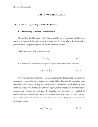 Este documento presenta una revisión bibliográfica sobre el equilibrio líquido-vapor de mezclas binarias y el uso de Visual Basic for Applications. Describe los principios termodinámicos del equilibrio líquido-vapor, diferentes tipos de mezclas binarias, y cómo calcular puntos de rocío y burbuja. También explica que VBA permite automatizar tareas en Excel como guardado automático y manejo de grandes bases de datos de una manera más eficiente.