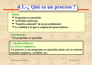 El documento habla sobre los procesos en sistemas operativos. Explica que un proceso es un programa en ejecución junto con su entorno asociado. Describe los servicios de procesos como creación, ejecución y terminación. También explica la jerarquía de procesos, el entorno de proceso, y los conceptos de multitarea y multiprogramación.