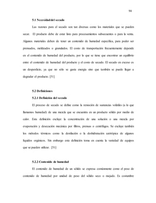 Este documento describe el proceso de secado de granos de arroz con cáscara. Explica que el secado es necesario para algunos sistemas de producción y que involucra la transferencia simultánea de calor y masa. Define el secado como la remoción de sustancias volátiles como la humedad de un producto sólido mediante calor. También describe las etapas del secado, incluyendo la velocidad constante y decreciente, y las zonas que se forman dentro de un material durante el secado.