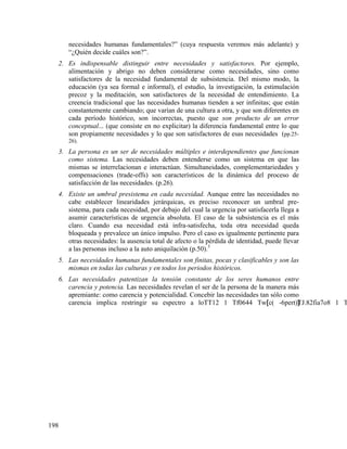 Max Neef et al. proponen una teoría de las necesidades humanas para el desarrollo basada en tres puntos principales: 1) distinguen entre necesidades (como subsistencia y protección) y satisfactores (como alimentación y seguridad social) para satisfacer esas necesidades, 2) plantean que las necesidades humanas son universales mientras los satisfactores son culturalmente específicos, y 3) presentan una matriz que cruza necesidades axiológicas con dimensiones existenciales de ser, tener, hacer y estar para mostrar posibles satisfactores