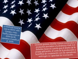 El documento explora la evolución de la industria de datos móviles y la transición de los dispositivos móviles hacia la producción de contenido, impulsada por la Web 2.0. Se destaca la creciente importancia de la conectividad y la usabilidad de las aplicaciones, a medida que los consumidores buscan contenido de valor en situaciones específicas, así como la competencia entre fabricantes como Nokia y Motorola en un mercado en rápida expansión. La necesidad de mejorar la experiencia del usuario y adaptar las interfaces móviles es fundamental para el desarrollo de esta nueva industria de datos móviles.