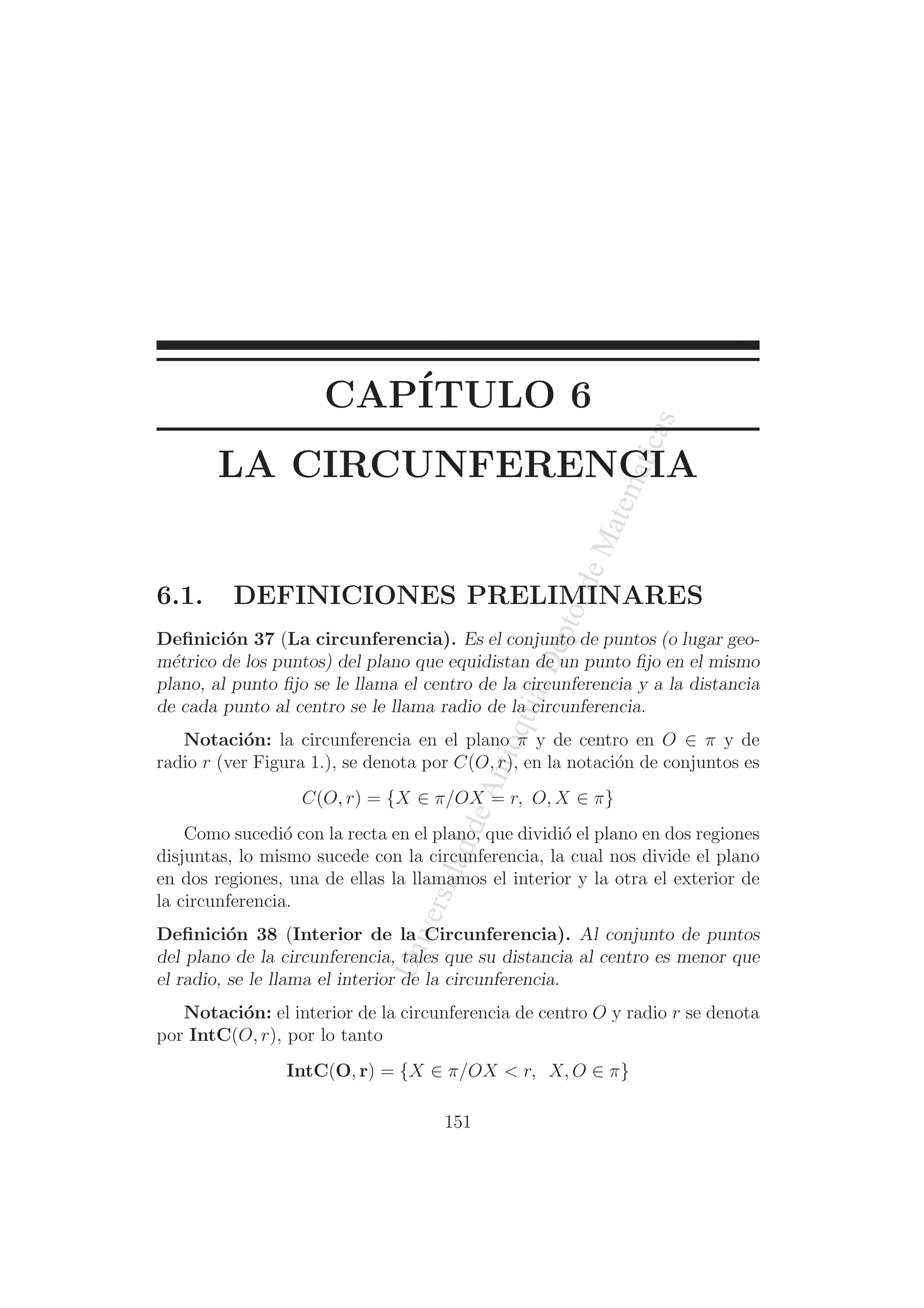 UniversidaddeAntioquia,Depto.deMatematicas CAP´ITULO 6 LA CIRCUNFERENCIA 6.1.DEFINICIONES PRELIMINARES Definici´on 37 (La circunferencia). Es el conjunto de puntos (o lugar geo- m´etrico de los puntos) del plano que equidistan de un punto fijo en el mismo plano, al punto fijo se le llama el centro de la circunferencia y a la distancia de cada punto al centro se le llama radio de la circunferencia. Notaci´on: la circunferencia en el plano π y de centro en O ∈ π y de radio r (ver Figura 1.), se denota por C(O, r), en la notaci´on de conjuntos es C(O, r) = {X ∈ π/OX = r, O, X ∈ π} Como sucedi´o con la recta en el plano, que dividi´o el plano en dos regiones disjuntas, lo mismo sucede con la circunferencia, la cual nos divide el plano en dos regiones, una de ellas la llamamos el interior y la otra el exterior de la circunferencia. Definici´on 38 (Interior de la Circunferencia). Al conjunto de puntos del plano de la circunferencia, tales que su distancia al centro es menor que el radio, se le llama el interior de la circunferencia. Notaci´on: el interior de la circunferencia de centro O y radio r se denota por IntC(O, r), por lo tanto IntC(O, r) = {X ∈ π/OX < r, X, O ∈ π} 151