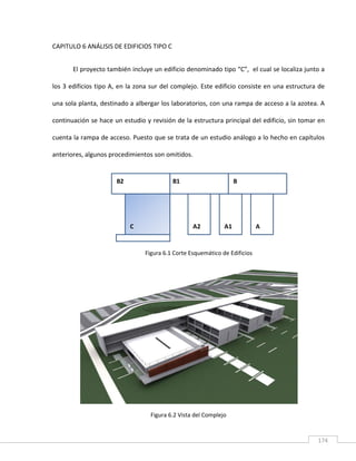 Este documento describe el análisis estructural realizado para el Edificio Tipo C del proyecto. El edificio C consta de dos estructuras unidas por zapatas combinadas. Se realizó un análisis separado para cada estructura denominadas C1 y C2. La bajada de cargas para ambas estructuras se presenta, así como los resultados de carga axial en cada columna. Finalmente, se describe cada tipo de zapata proyectada y se verifica que cumplen con la capacidad de carga del suelo.