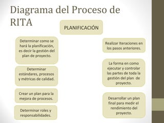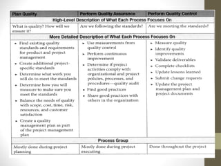 Este documento presenta información sobre la gestión de la calidad en proyectos. Explica que la gestión de la calidad incluye establecer estándares, procesos y métricas de calidad, y crear un plan de mejora continua. También describe los pasos de planificación, ejecución, monitoreo y control de la calidad en un proyecto. Finalmente, brinda ejemplos de herramientas como diagramas de flujo y de control que pueden usarse para garantizar la calidad.
