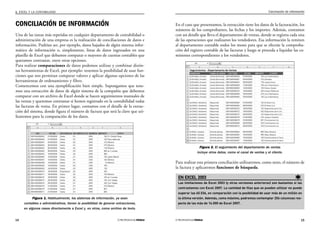 Este documento describe las herramientas de Excel que facilitan tareas contables como la conciliación de información. Explica cómo usar funciones como BUSCARV para comparar datos entre dos planillas y encontrar valores coincidentes. También cubre el uso de referencias relativas y absolutas al copiar fórmulas, e insertar filtros para mostrar solo registros con diferencias.