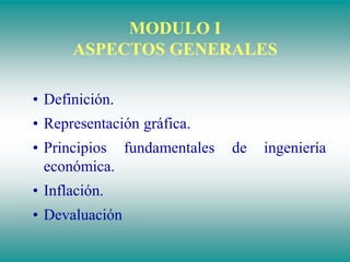 El documento proporciona una introducción a los conceptos básicos de ingeniería económica, incluyendo definiciones, principios fundamentales como el valor del dinero en el tiempo y la racionalidad financiera, y temas como inflación, tasas de interés, liquidez y riesgo. Explica los diferentes tipos de evaluación de proyectos y la diferencia entre interés simple e interés compuesto.