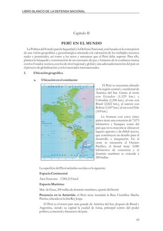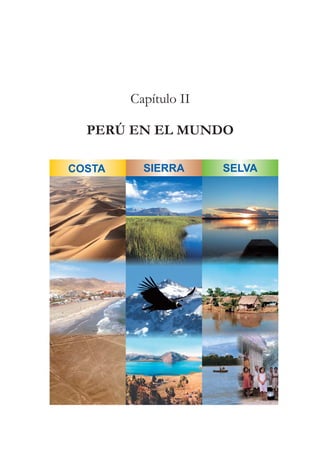 El documento analiza la geopolítica y geoestrategia del Perú, destacando su ubicación, características territoriales y la importancia de sus tres regiones naturales: costa, sierra y selva. Se abordan los recursos naturales, la biodiversidad y las proyecciones demográficas, así como la necesidad de infraestructura para el comercio internacional en un mundo globalizado. Finalmente, se enfatiza en la importancia del Perú como un punto estratégico para la integración regional y la proyección hacia mercados internacionales.