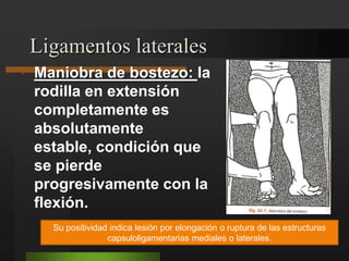 Este documento describe varias maniobras de diagnóstico para evaluar lesiones en ligamentos y meniscos de la rodilla. Resume las maniobras de bostezo, cajón, Lachman, Slocum y pivote para examinar ligamentos laterales y cruzados. También explica los signos de McMurray y Finocchieto para detectar lesiones meniscales.