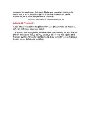 Este documento trata sobre las faltas y sanciones de los trabajadores según la ley española. Establece que los trabajadores pueden ser sancionados por la dirección de la empresa por incumplimientos laborales de acuerdo a la graduación de faltas y sanciones en la ley o el convenio colectivo aplicable. También establece los plazos de prescripción para diferentes tipos de acciones derivadas del contrato laboral o infracciones cometidas por el trabajador o la empresa.