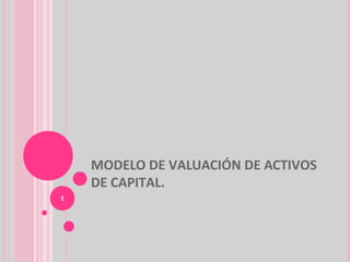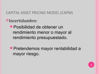 El documento presenta el Modelo de Valoración de Activos de Capital (CAPM), el cual relaciona el riesgo no diversificable de un activo con su rendimiento esperado. El CAPM utiliza la ecuación rA = rf + β(rm - rf) donde rA es el rendimiento del activo, rf es la tasa libre de riesgo, rm es el rendimiento del mercado, y β es el coeficiente de riesgo del activo. El β mide qué tan volátil es el rendimiento de un activo en comparación con el mercado. Cuanto mayor sea el