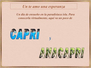 El documento describe una visita a la isla de Capri, ubicada en el mar Tirreno frente a la costa de Nápoles, Italia. Comienza describiendo el viaje en barco desde Nápoles y la llegada a Capri, donde los visitantes exploran las principales atracciones como la Gruta Azul y la ciudad de Anacapri. Luego visitan otras áreas de Capri como los Jardines de Augusto, tiendas y restaurantes. El documento termina reflexionando sobre lo hermosa que es la isla y la esperanza de poder regresar pronto.