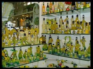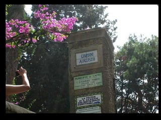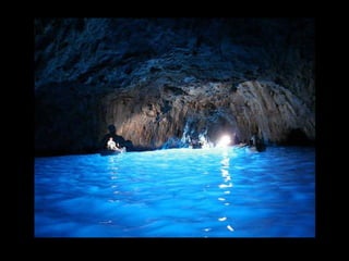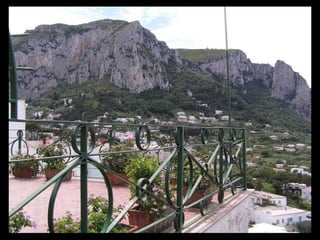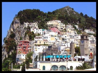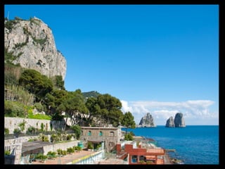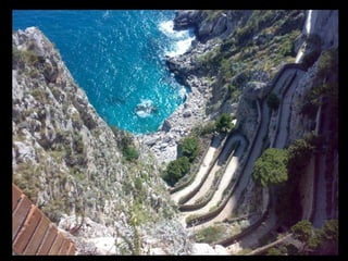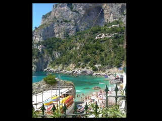 Este documento proporciona una descripción general de la isla de Capri, Italia, destacando sus principales atracciones como callejones medievales, impresionantes paisajes, la Gruta Azul con aguas de color azul turquesa, los acantilados, el Palacio del Mar y playas como Marina Piccola y Marina Grande. También describe brevemente la construcción del muelle en Marina Grande y la estación de funicular, así como las vistas panorámicas desde el Monte Solaro y la Vía Krupp.