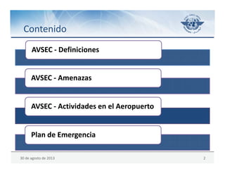 Este documento proporciona información sobre seguridad de la aviación (AVSEC), incluyendo definiciones, amenazas, actividades en el aeropuerto y planes de emergencia. Explica que AVSEC implica medidas para proteger la aviación civil contra actos ilícitos mediante controles de acceso, inspecciones y protección de aeronaves. También destaca la importancia de la coordinación entre AVSEC y planes de emergencia de salud pública para controlar brotes de enfermedades.