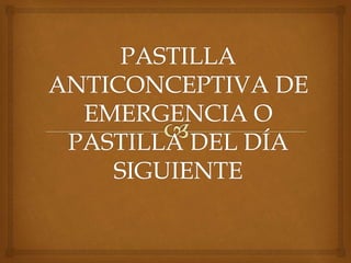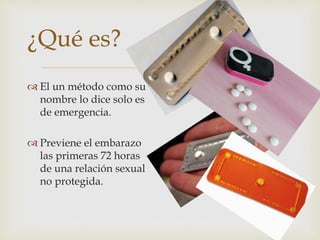 Este documento describe la píldora del día después, un método anticonceptivo de emergencia que previene el embarazo en las primeras 72 horas después de una relación sexual sin protección. Funciona impidiendo la fecundación o la liberación del óvulo. Contiene levonorgestrel y debe tomarse dentro de las 72 horas, según las instrucciones. Solo se usa en casos de emergencia y no protege contra enfermedades de transmisión sexual.
