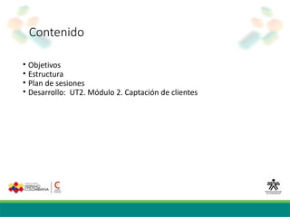 Este documento presenta un diplomado en ventas consultivas en mercados globalizados ofrecido por el SENA. El diplomado se compone de cuatro módulos y busca fortalecer las competencias de los participantes en el diseño y gestión de estrategias de venta consultiva aplicadas a empresas de servicios o productos. Una de las sesiones cubre técnicas para la captación de clientes como definir el target, segmentar el mercado, escuchar al cliente y ofrecer un valor diferencial.