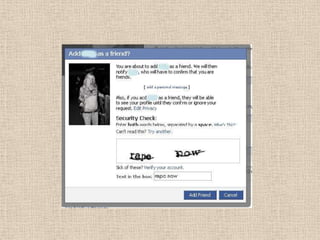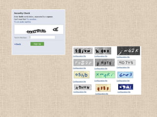 El documento explica qué es un CAPTCHA y para qué sirve. Un CAPTCHA es una prueba de desafío-respuesta que distorsiona letras para diferenciar humanos de máquinas. Se usa para evitar que robots utilicen servicios como encuestas o correo electrónico y asegurar que el remitente de correo es humano. Un CAPTCHA es automático y su algoritmo es público.