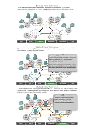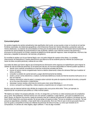 Este capítulo describe cómo las redes de datos influyen en nuestras vidas cotidianas y relaciones sociales y comerciales. Explica que las redes evolucionaron para agregar nuevas formas de comunicación como voz, video, texto y gráficos. También presenta algunas de las herramientas de comunicación más populares en la actualidad como mensajería instantánea, blogs, wikis y podcasting. El capítulo analiza cómo estas redes y herramientas permiten la formación de comunidades globales y nuevas oportunidades para compartir información.