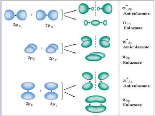 3) La teoría de orbitales moleculares y cómo los orbitales atómicos se combinan para formar orbitales moleculares enlazantes y antienlazantes.