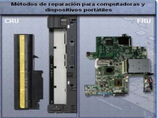 Este documento describe varios métodos de comunicación inalámbrica como Bluetooth, Wi-Fi, redes celulares y satelitales que pueden usarse para conectar computadoras portátiles y teléfonos inteligentes. También discute métodos para reparar estos dispositivos y opciones para agregar o actualizar su almacenamiento.