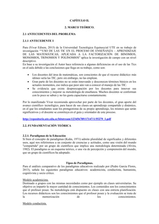 Este documento presenta el marco teórico de una investigación sobre el uso de videos educativos. Inicialmente, resume un antecedente sobre las deficiencias en el uso de TIC en las aulas de matemáticas. Luego, describe varios paradigmas educativos, modelos pedagógicos, teorías del aprendizaje, métodos didácticos y términos clave. Finalmente, fundamenta la investigación legalmente y caracteriza la variable del video educativo.